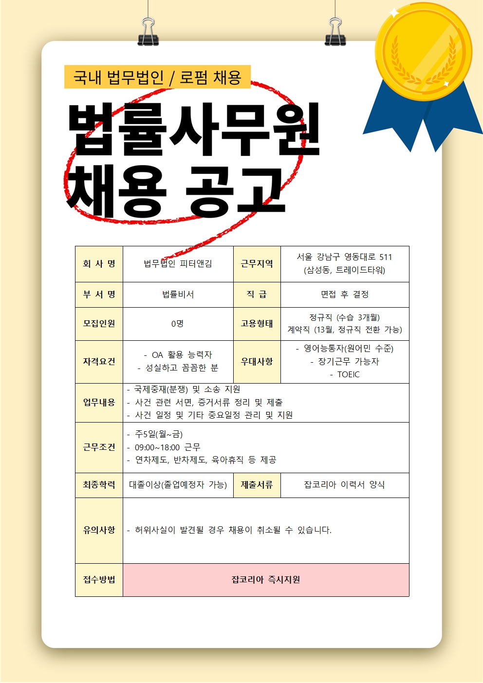 [법률사무원] 법무법인 피터앤김 법률비서 채용 페이지 정보 작성자 바른법률HR학원 댓글 0건 조회 71회 작성일 26-04-10 11:07 목록 본문 관련링크 https://www.jobkorea.co.kr/Recruit/GI_Read/48953372?Oem_Code=C1&logpat… 52회 연결 이전글[법률사무원] 법무법인 랜드로 사무직원 채용 26.04.10 다음글[법률사무원] 법무법인 새별 송무비서 채용 26.04.10 댓글 0 댓글목록 등록된 댓글이 없습니다.
