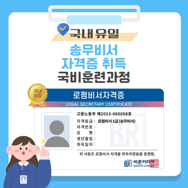 로펌비서 자격증 정보는 한국직업능력연구원 민간자격정보서비스 홈페이지 및 에스앤에스 로펌학원 홈페이지에서 확인이 가능하며 S&S로펌학원은 2024년 고용노동부 취업률 우수훈련기관으로 선정된 법률사무원 취업교육 전문학원으로 현재 로펌비서 자격증 무료 발급 이벤트를 진행 중이니 많은 관심 부탁드린다고 전했다.