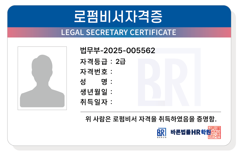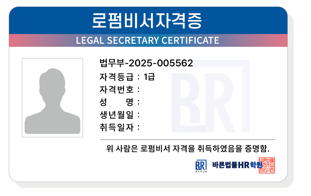자격명 | 로펌비서 (Legal secretary) | 자격 발급기관 | (주)바른법률에이치알학원 |